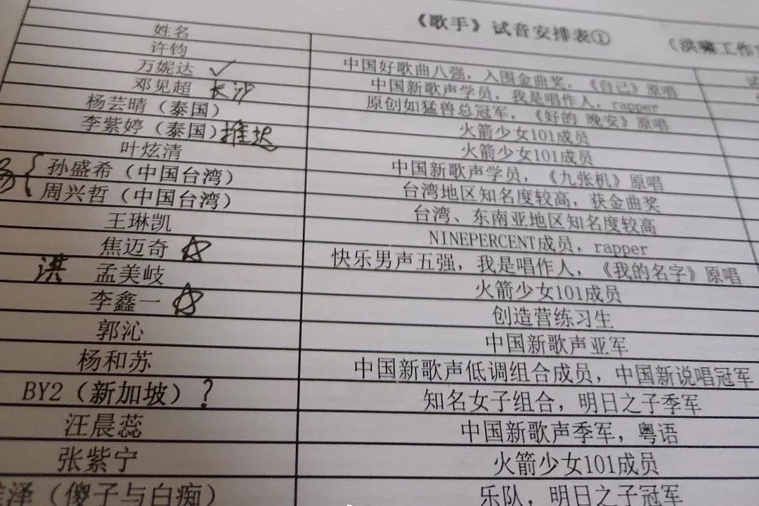 其实,此前还曾流露出疑似《歌手2021》的试音名单,当时万妮达、孟美岐、李鑫一、郭沁就出现在了名单中,不过大多都是偶像歌手和不知名的小众歌手,孟美岐的队友sunnee杨芸晴、李紫婷张紫宁都出现在了名单中。